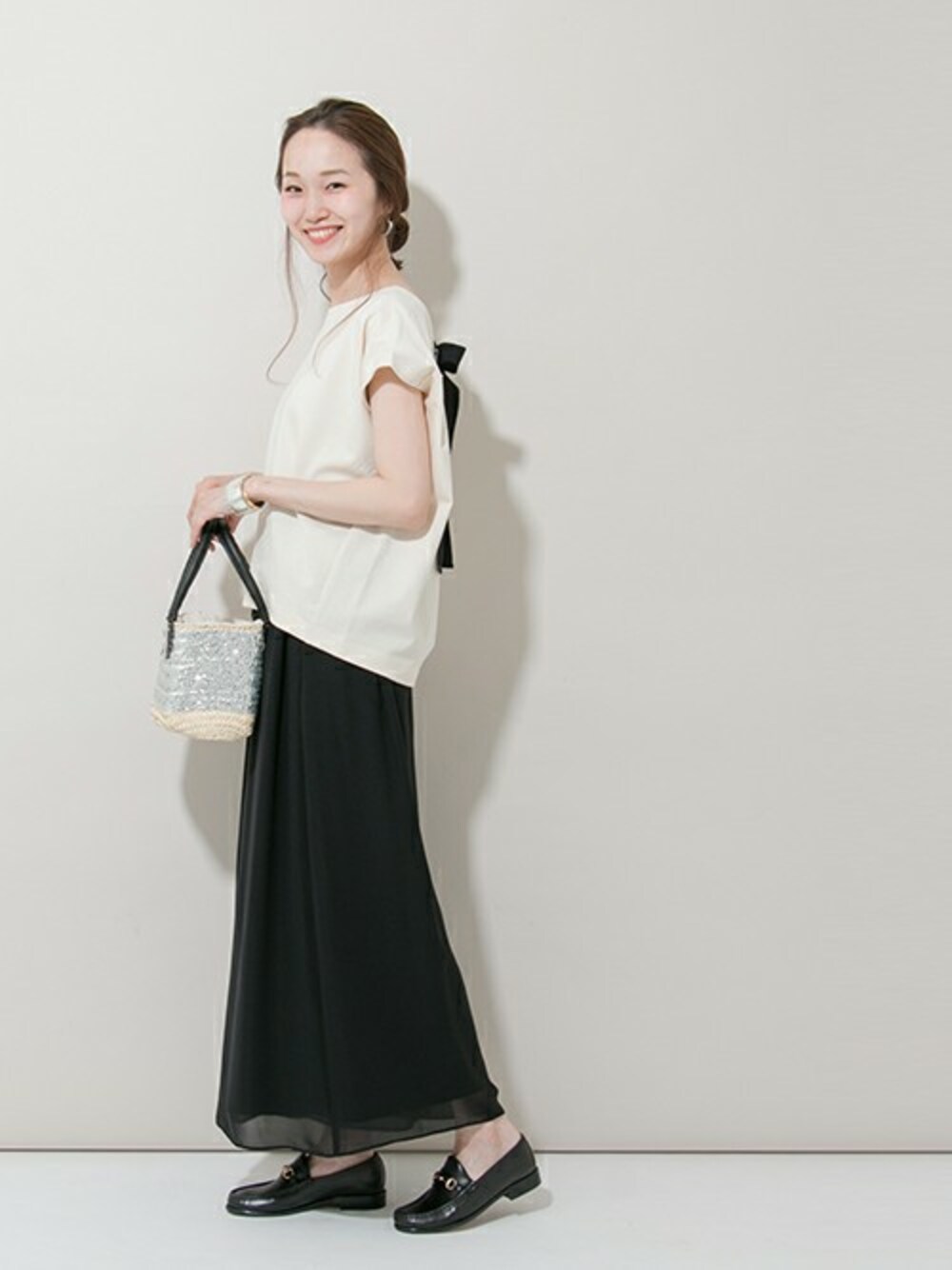 一見シンプルなモノトーンスタイル。 バックスタイルにリボンがあるので、ポイントになってくれます◎ mio Instagram →M_OOO mio blog→http://ur-blog.jp/ur/?sid=mio