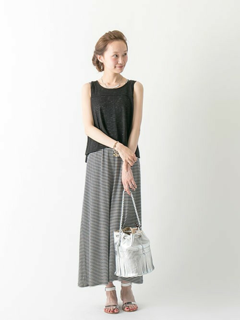 マキシワンピースをシルバー小物でサラリと上品に。