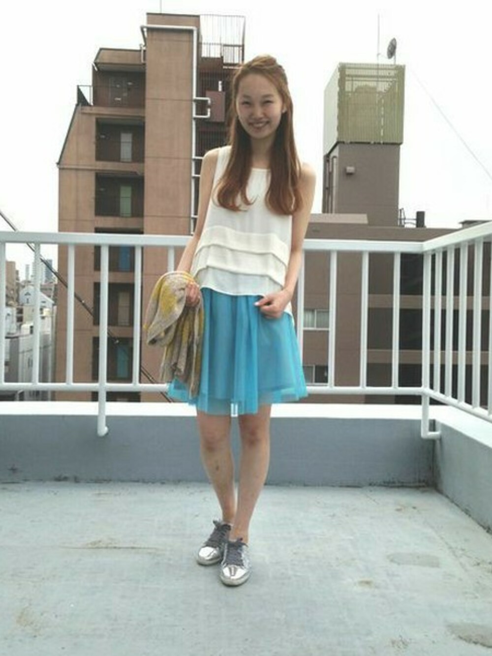 ティアードのブラウスにチュールのスカートでフェミニンさを出しました。甘くなりすぎないように足元はスニーカーで。素足で履いたのもポイントです。