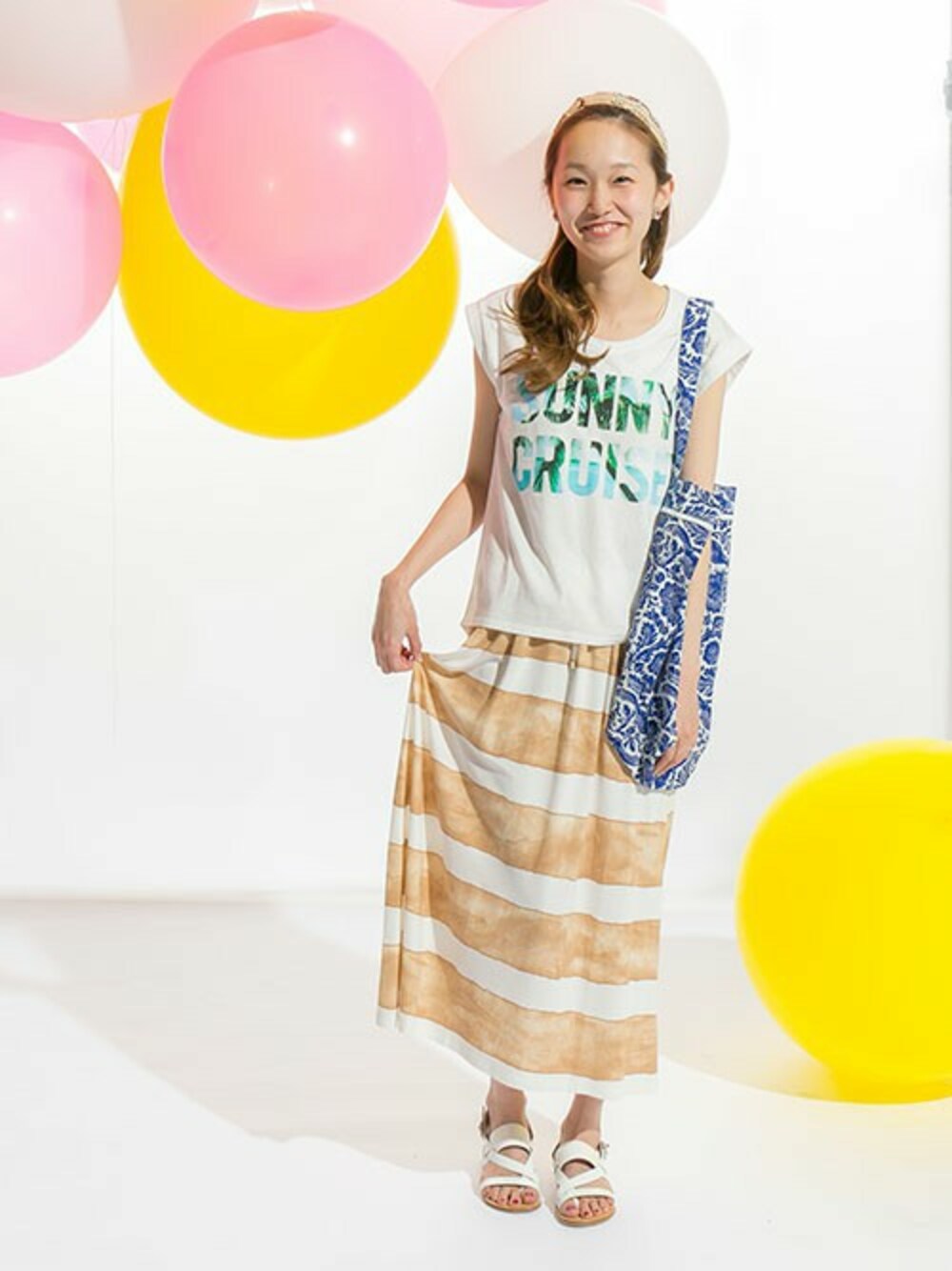 めいっぱい夏を楽しんだレイヤードスタイルです。ボーダーワンピにプリントTeeを合わせてプリント遊びを。うまくまとまるよう、合わせる色をベージュ×ブルートーンで統一させました。