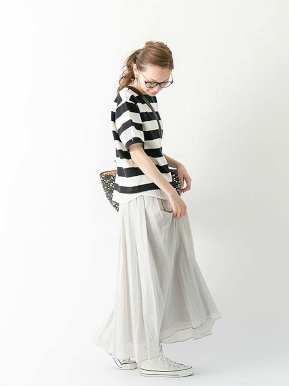 ボーダートップスは今年のマストアイテム!部分的にレース使いがあり、一枚でサマになります。エアリーなマキシ丈のスカートはスモーキーなカラーを選び、クリーンにまとめました。