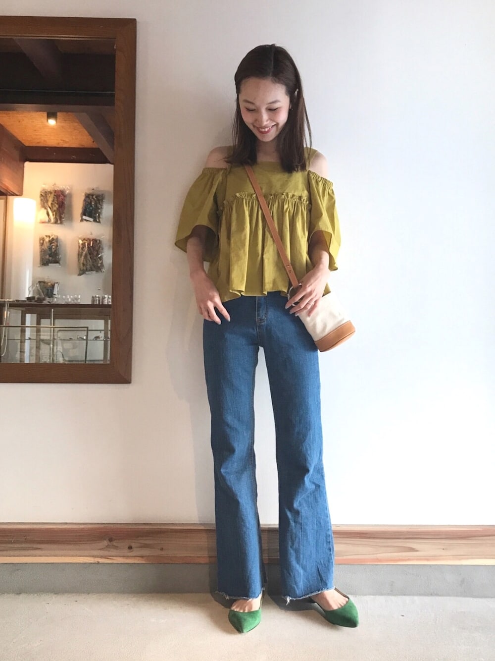 ピスタチオグリーンが綺麗なブラウスをフレアデニムでカジュアルに◎ 靴もグリーン系でまとめました☺️🙆🏻 🙊mio instagram →m_ooo🌸