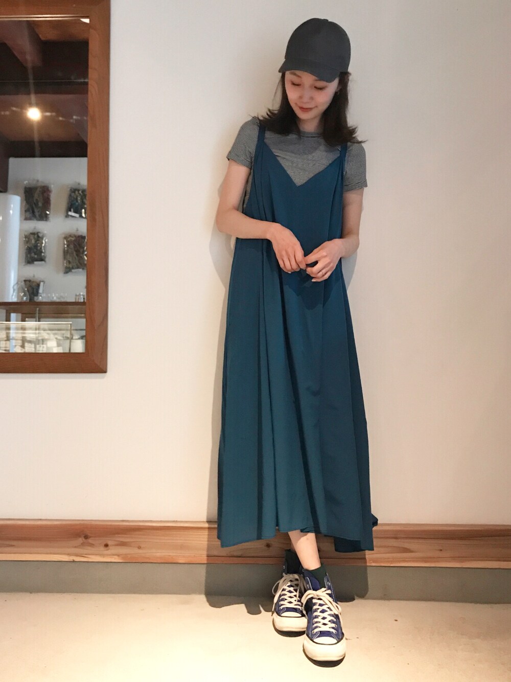 深みのあるブルーのきれいめワンピースをキャップとスニーカーでカジュアルにはずしました🙃🙃 🙊mio instagram →m_ooo🌸