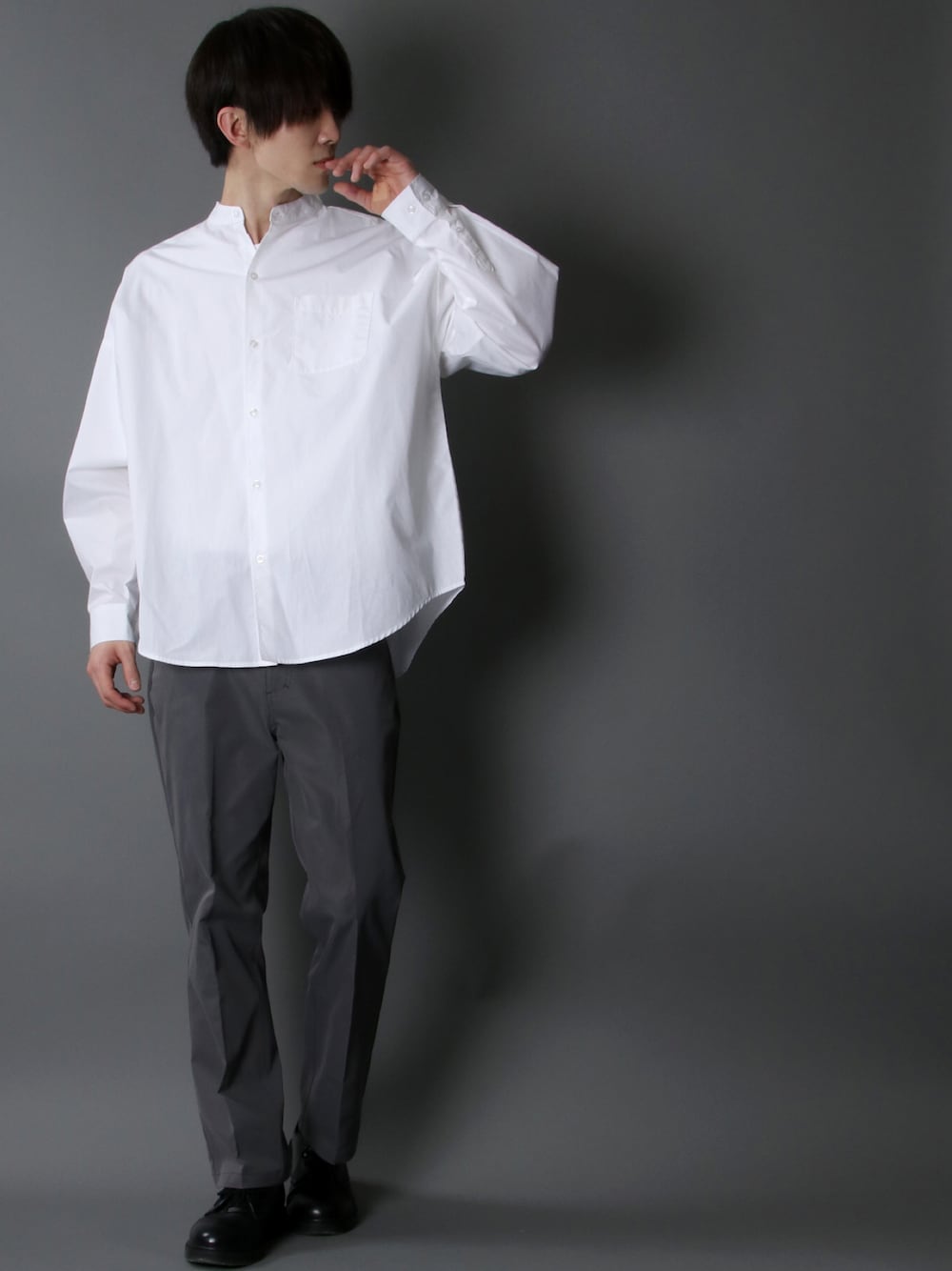 狩野 博文のシャツ/ブラウス「Oversize Drop shoulder Band Collar broadcloth shirt/オーバーサイズ ドロップショルダー バンドカラー ブロード シャツ」を使ったコーディネート