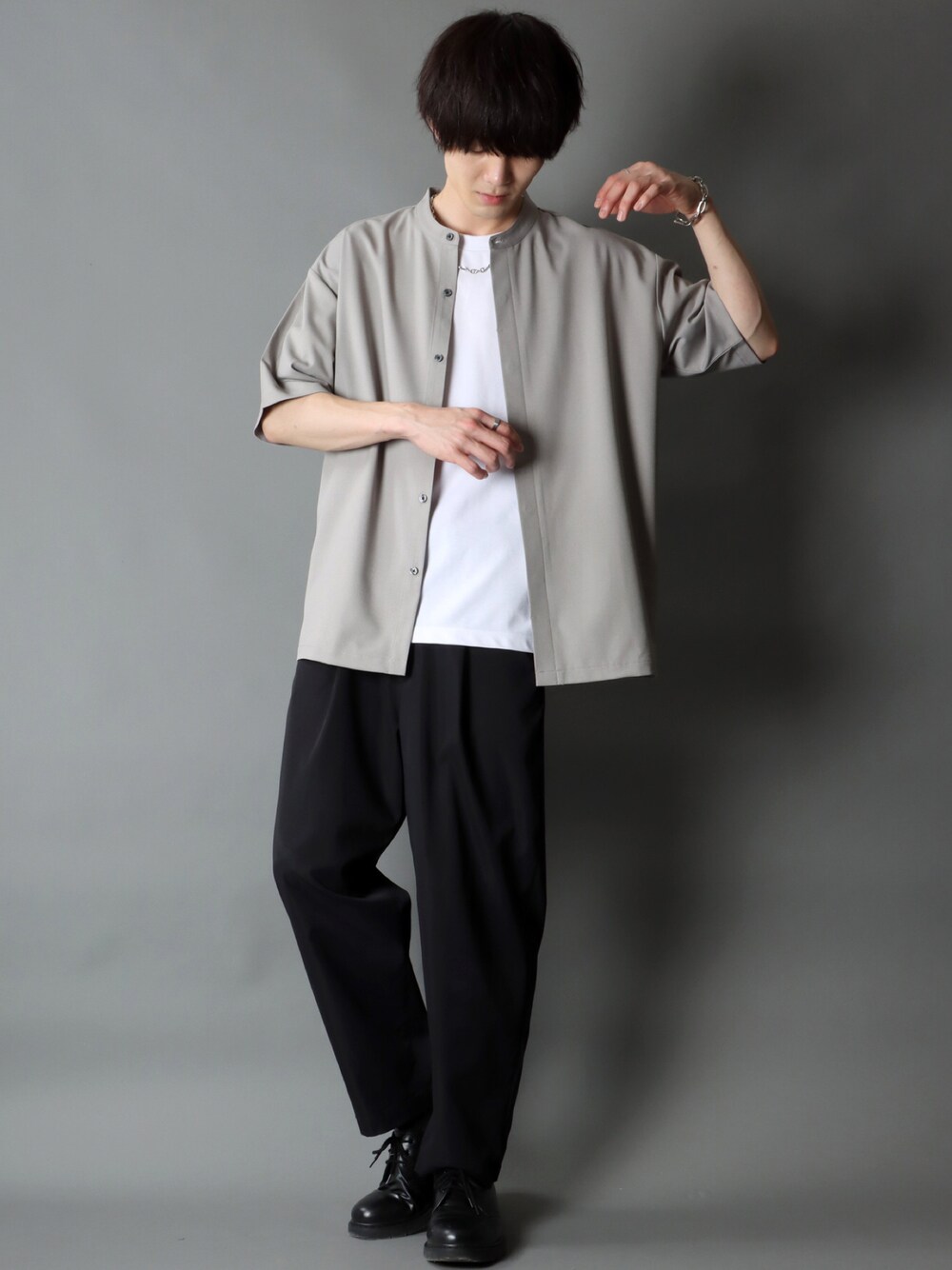 狩野 博文のシャツ/ブラウス「Polyester tropical Drape Band Collar shirt/ポリトロ ドレープ バンドカラー 半袖 シャツ」を使ったコーディネート