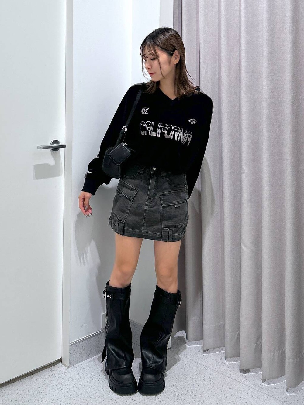⭐️150cm [トップス] ベロア素材のゲームシャツ🎮 薄手なのでインしても使いやすいアイテム🖤 [ボトム] ミニ丈のスカートですがインパン付きなので安心🫶🏻