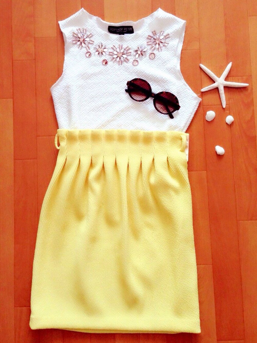 イエロー系のスカートを着用したレディースの夏コーディネートの1枚目の写真