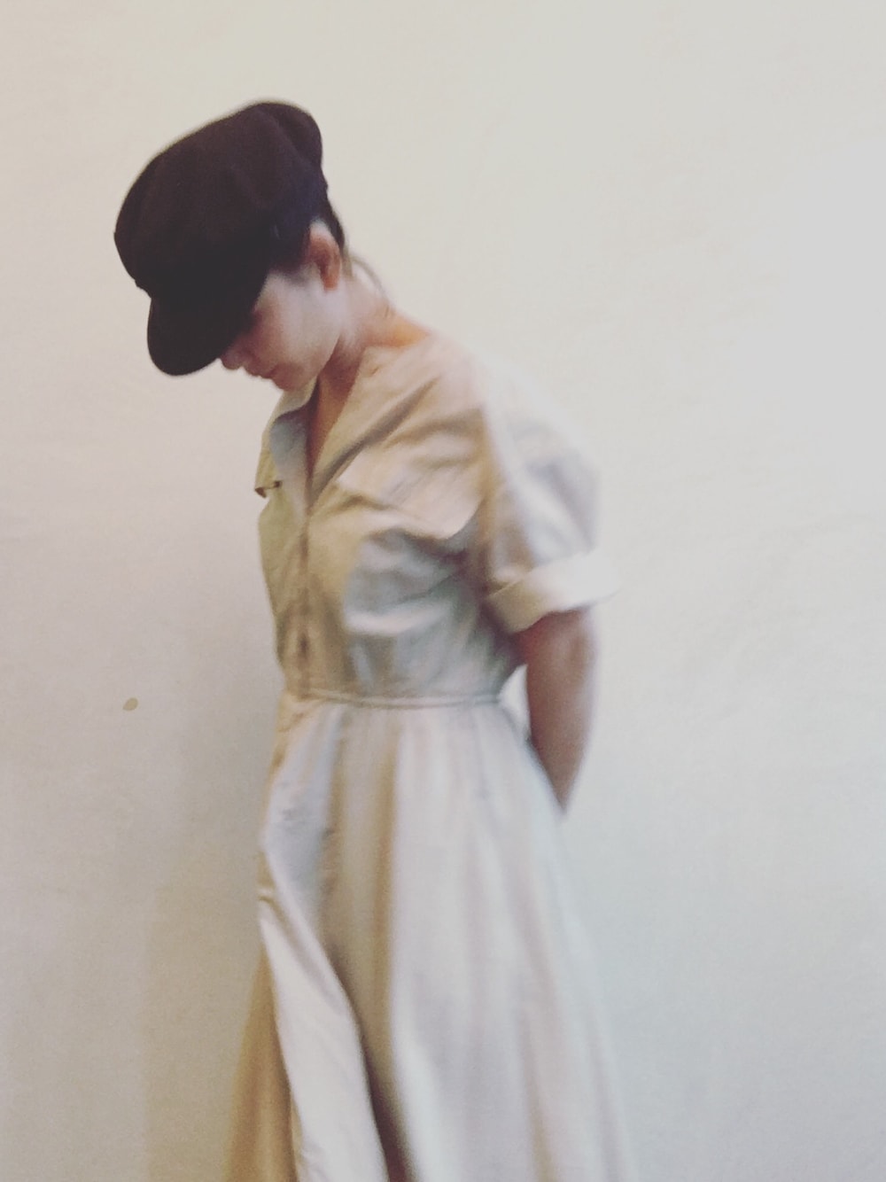 古着コーデ♡ 髪の毛はラフに束ねてマリンキャップの中にイン。