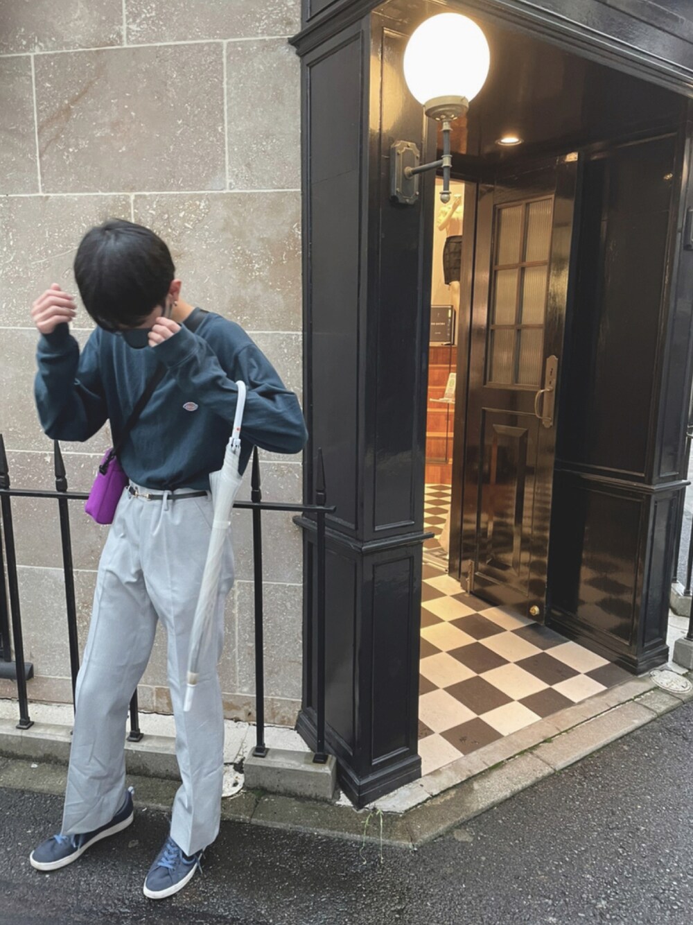 青白系統を意識してます。Dickiesのワンポイント刺繍が主張しすぎない感じでいいんです!!あと実はベルトが女性用でめっちゃ可愛い🥺最近、女性の服とかアクセサリーを着こなそうと努力してます!