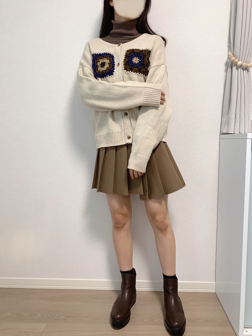 おはようございます*\(^^)/* ご覧頂きありがとうございます❤︎ ▽手編みのニットカーディガンを使ったガーリーコーデ☺︎ このカーディガンはバックスタイルも手編みの変わったデザインになっていて、前後2wayで着られるので色々なスタイルを楽しむことが出来ます♩ どこか暖かみのある雰囲気がお気に入りのポイントです★ 《着用サイズ》 タートルネック M スカート S(少し大きめ)