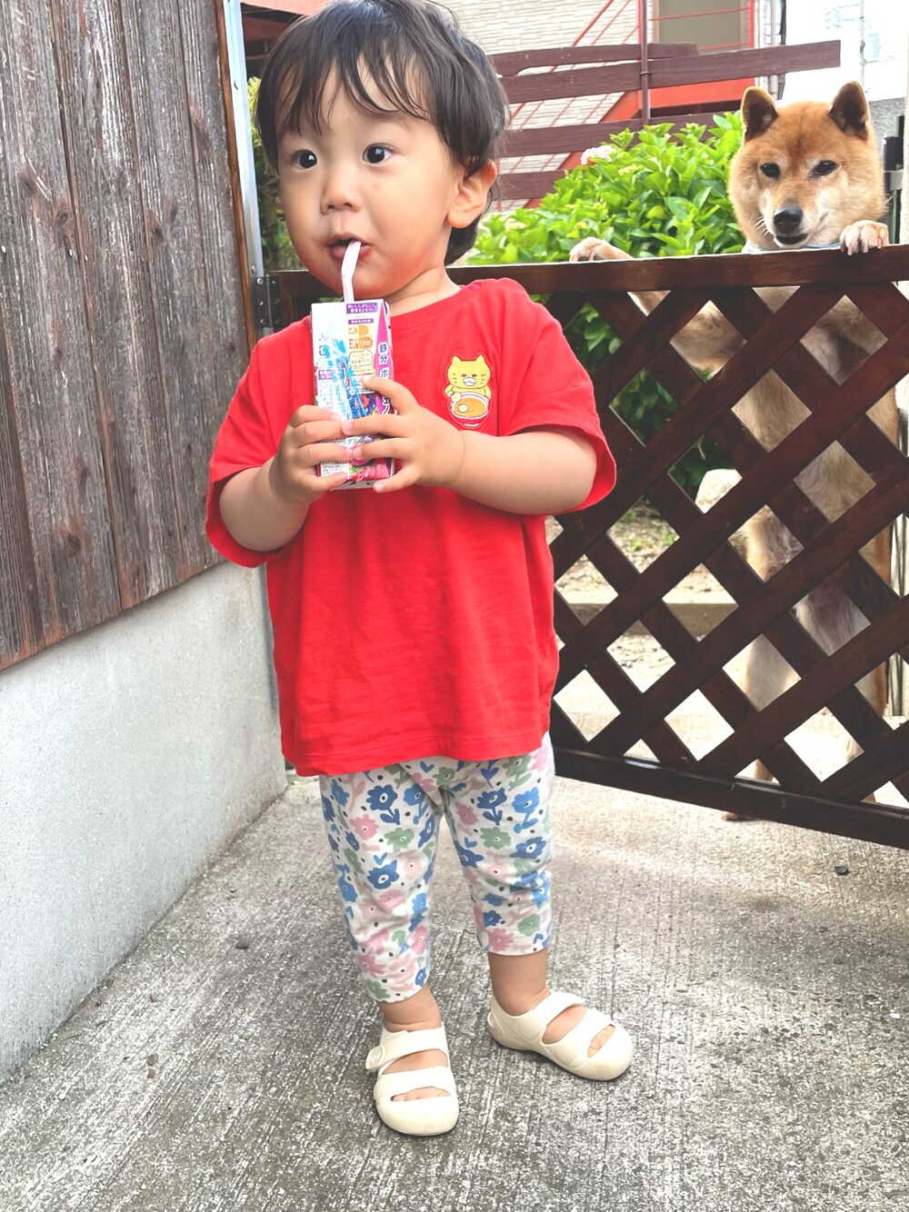 保育園終わりの息子&柴犬👦🐕 UNIQLOのノラネコぐんだんUT可愛い♡ パンツは7分丈で500円でした。 男の子でも可愛く履ける◎