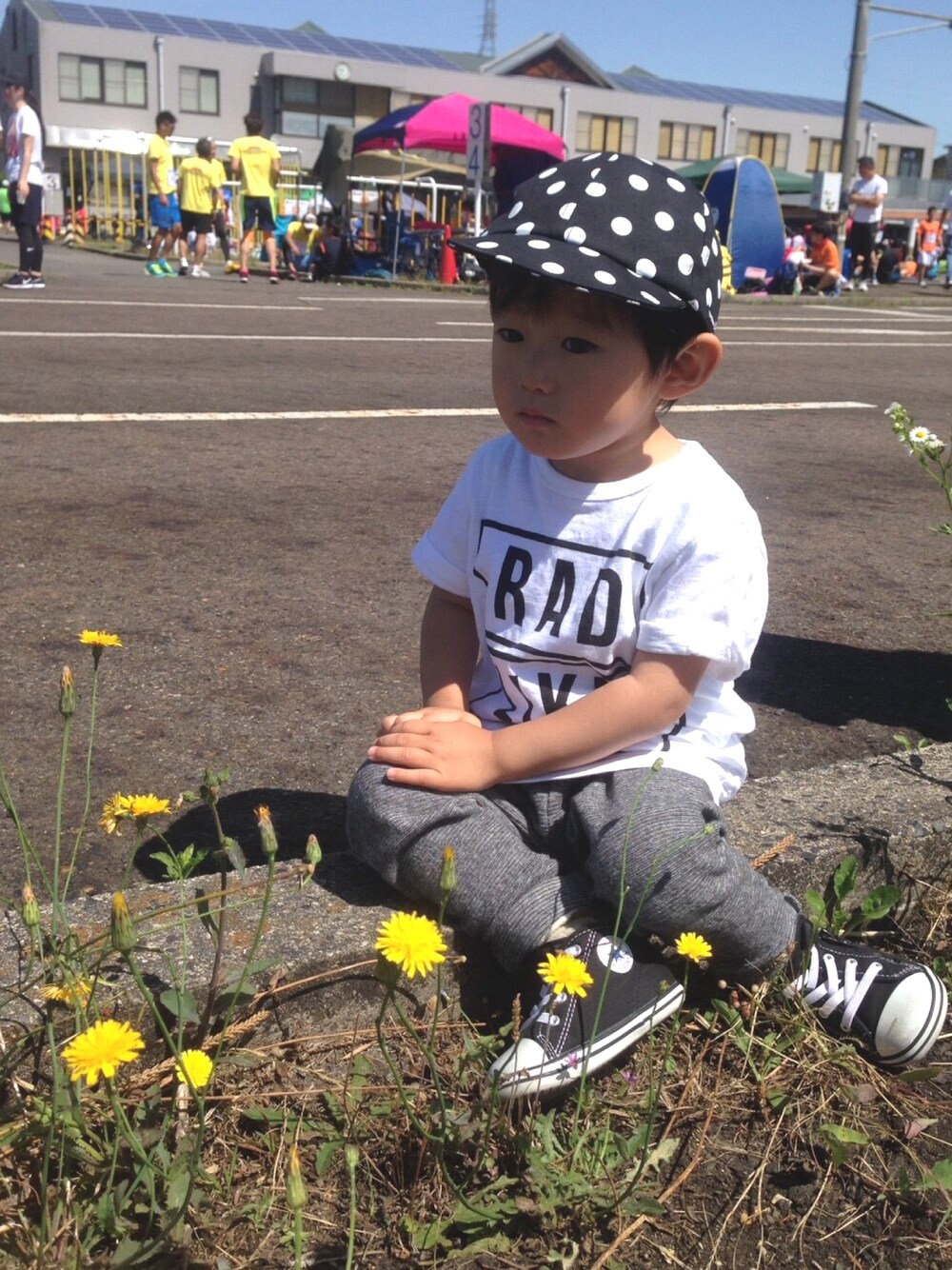 ちょっとオネエさん座りですが、、、 この日は暑かったのでドット柄のキャップを✨ キャップが柄なので服はシンプルに☺︎