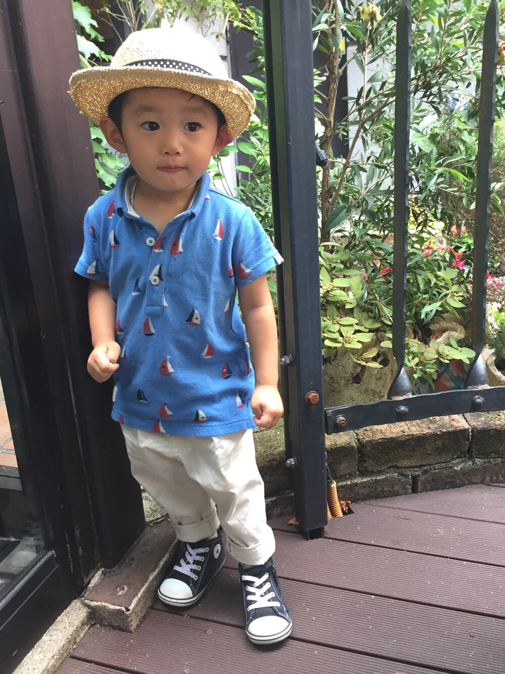 カフェで休憩🍹 暑いけどテラス席でのんびり☺︎ ヨット柄のポロシャツに白いパンツで夏っぽく🍉 良いね👍save♡ありがとうございます✨