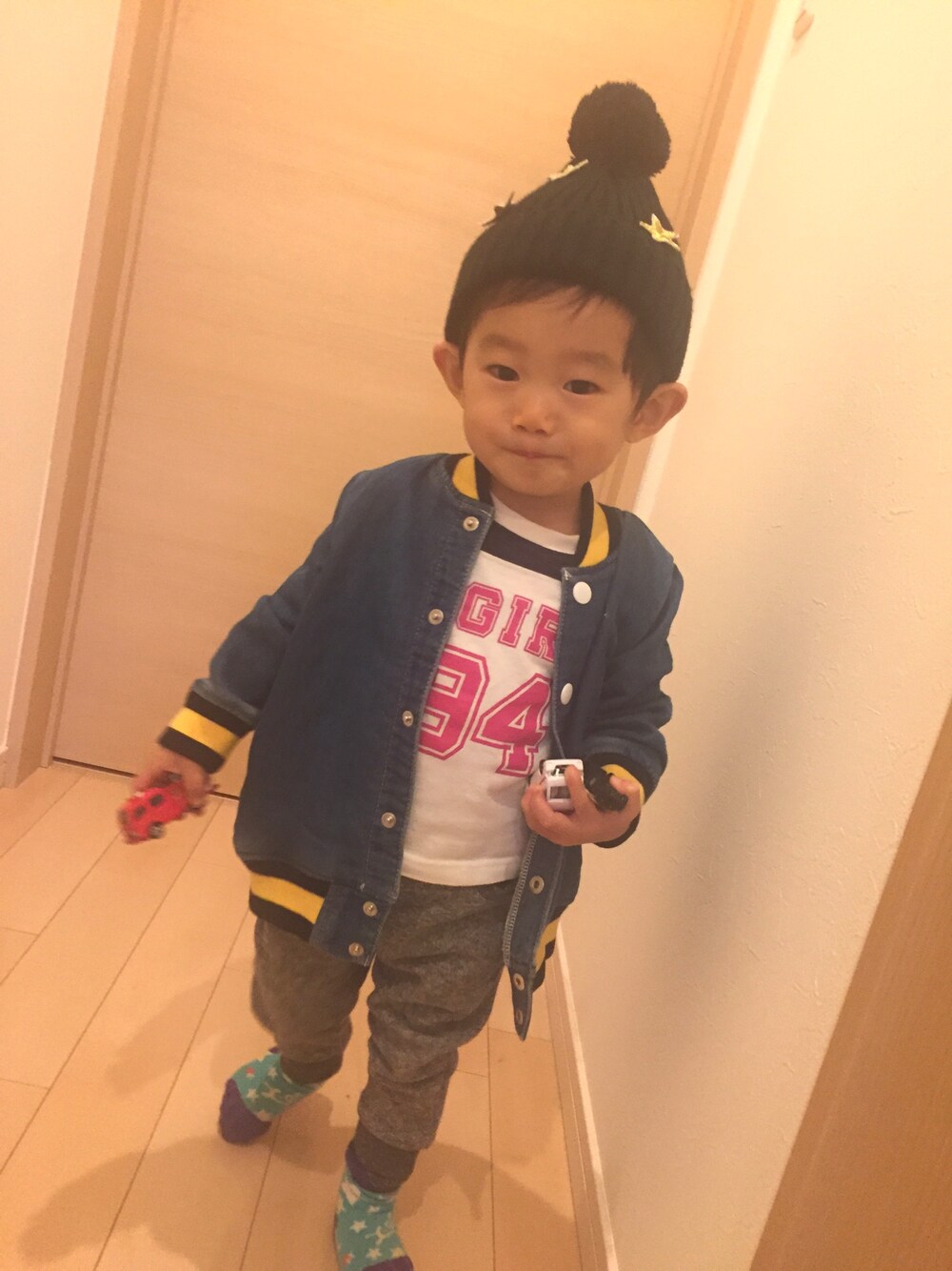 カジュアルコーデ✨ 今日も大好きなトミカをいっぱい持ってパチリ📸