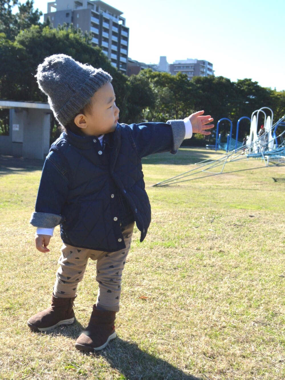 お父さん歩くの遅いから手繋いであげるの。 早くおいでーー 今日はお父さんとGジャン×ダウンベストで合わせたんだ♡