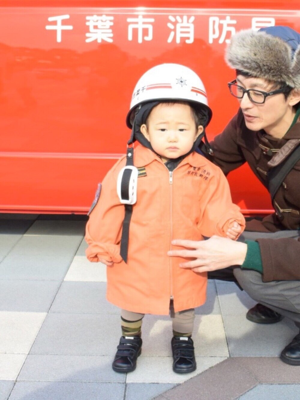 先日千葉市消防出初式に行った時に着せてもらった、特別救助隊のユニフォーム。 真顔ですが、自らヘルメットをかぶり、嬉しかった模様♡ ヘリコプター、救急車、消防車と間近で見れて、大興奮でした。 靴は父さんとお揃いの黒のスタンスミス♡