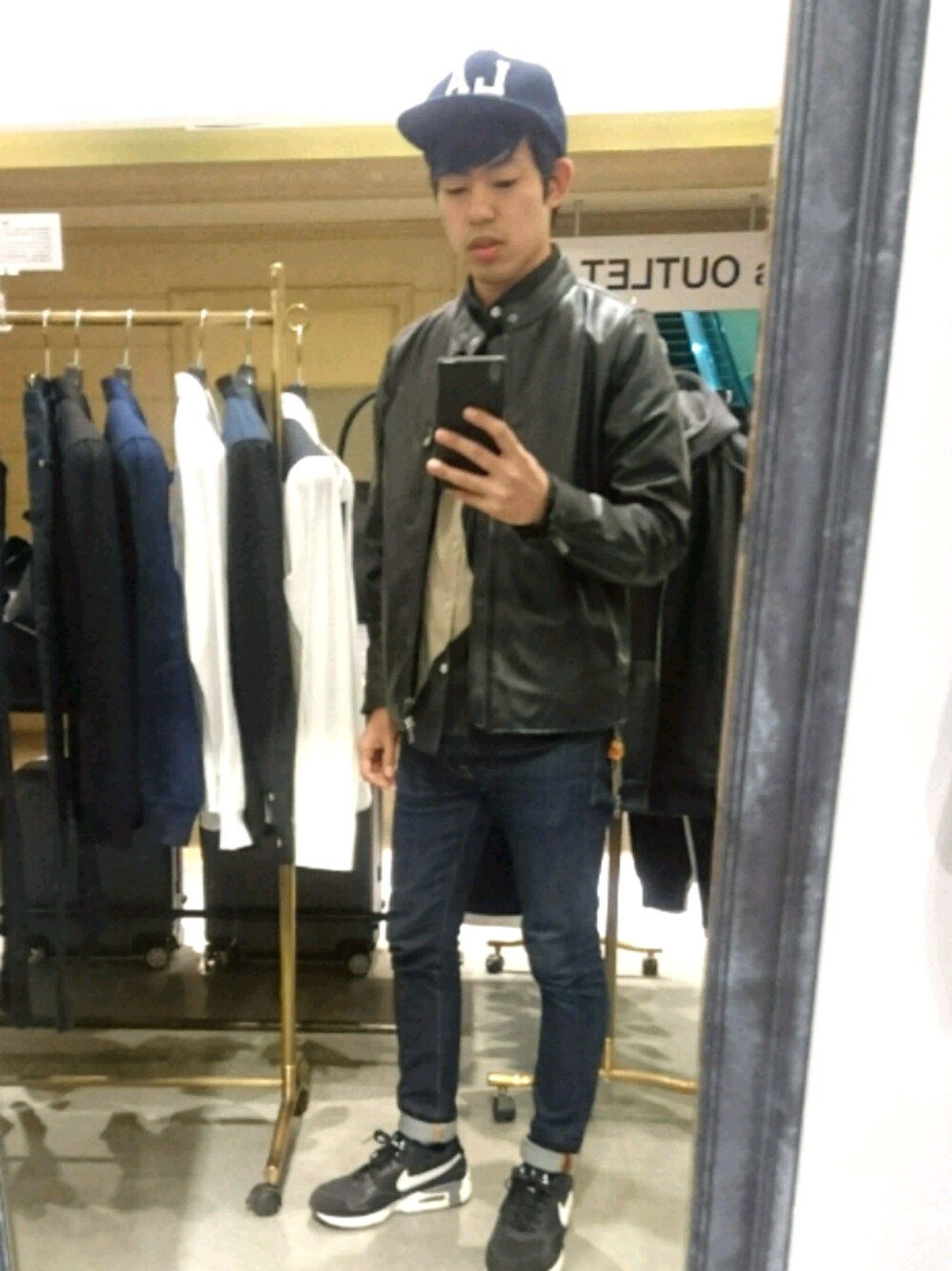 レザーとキャップを使ったコーデをしたいと思っていたので今日はこんな感じです! カジュアルに寄せてスニーカー、、 最近NIKEばっかり使いすぎな!