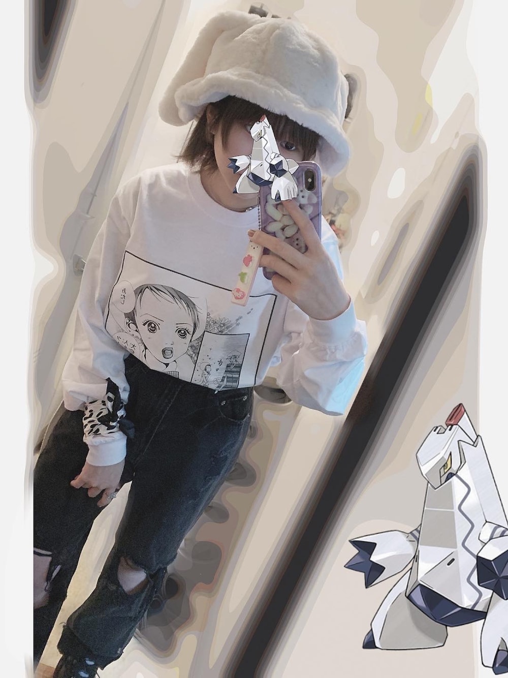 実果子かわいいよね〜^ - ^🖤 ズボンは黒だけど、ホワイトコーデ! 帽子も可愛いでしょ〜うさぎ。🐇