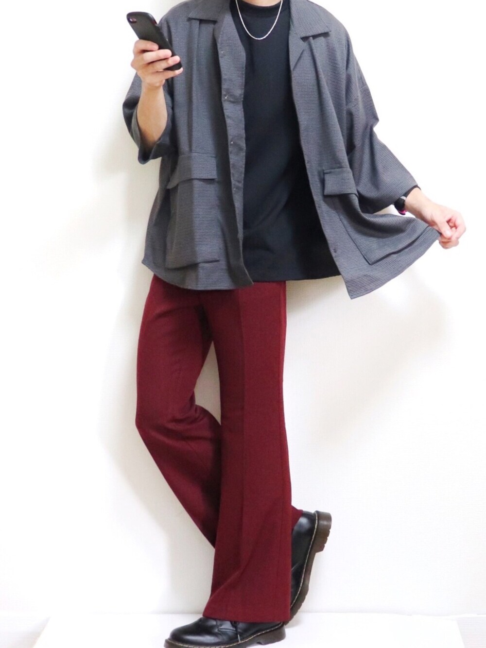 コーデをご覧いただきありがとうございます😊 CASPER JOHNのチェックシャツと ワインのフレアパンツを合わせた コーデです! コーデのポイント 1.チェック柄や、ワインレッドの色で 秋の季節感を演出! 2.黒のトップスとシューズで コーデを引き締める! 3.綺麗めたくさんで秋の上品さを演出! コメント、リクエスト等、いいね👍も お気軽にお願いします🙇♂️