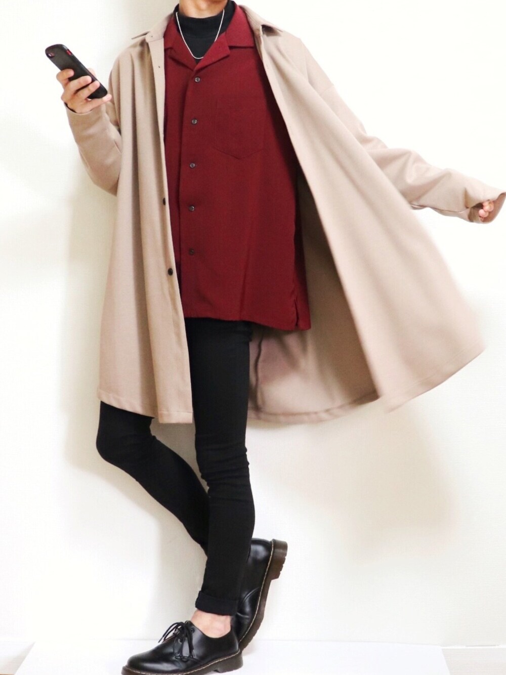コーデをご覧いただきありがとうございます😊 ベージュのコートとワインレッドのシャツ をあわせた秋コーデです! あー紅葉🍁みたいー笑笑 撮影仲間募集中です! このコーデでよかったら紅葉狩り 行きましょ!!! コーデのポイント 1.オーバーサイズのコートと スキニーでVシルエットを意識! 2.ベージュとワインレッドの 秋の相性抜群配色!! 3.スキニーや革靴できれいめに よせる!! コメント、リクエスト等、いいね👍も お気軽にお願いします🙇♂️