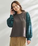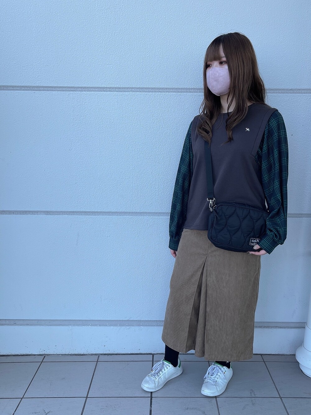 緑チェックの切り替えプルオーバーで大人可愛く、コーデュロイのロングスカートにスニーカーを合わせてどんなシーンにもピッタリなコーデです♪