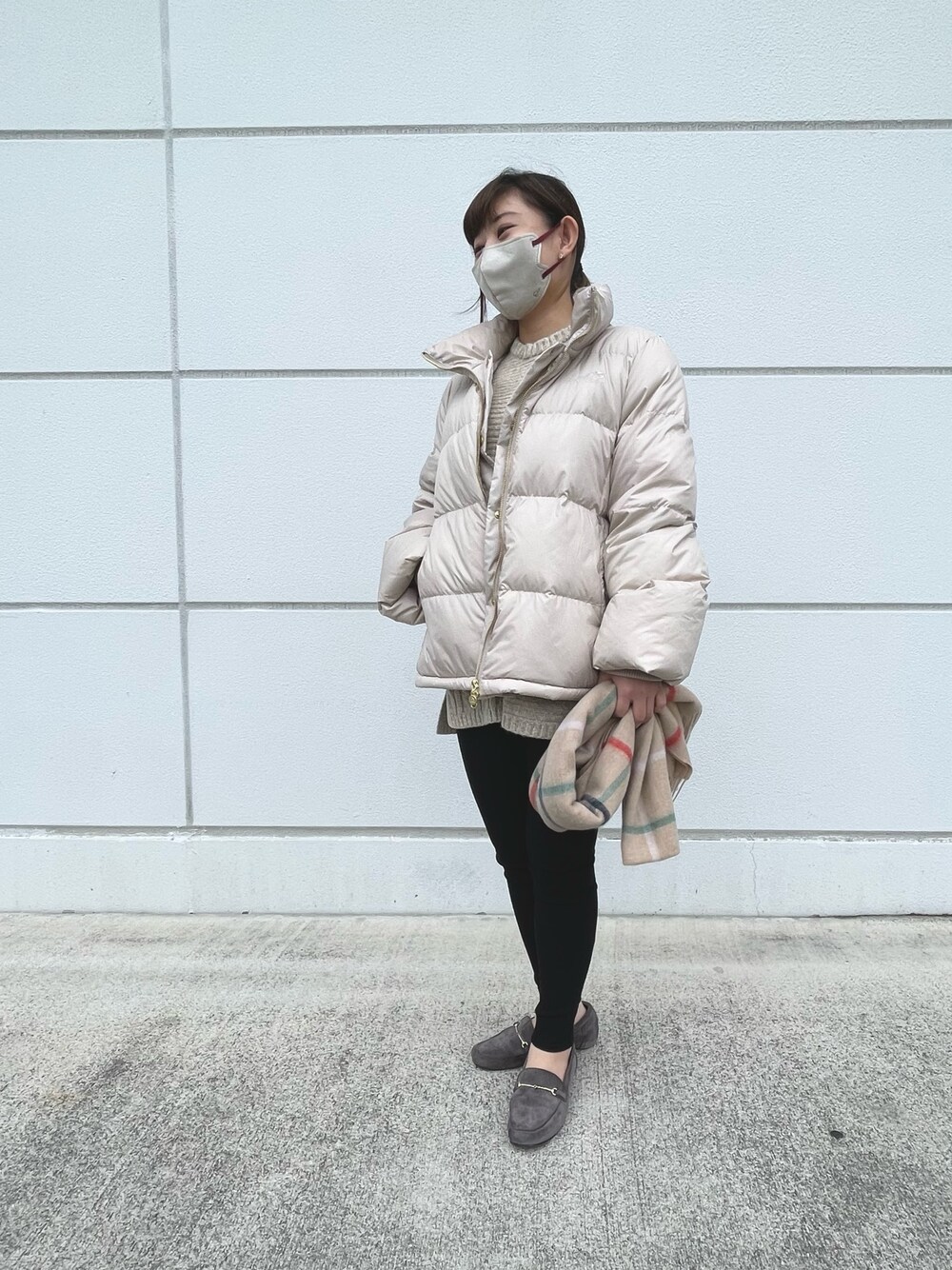 パッチワークケーブルニットにきれいめショートダウンを合わせて、黒スキニーでスタイルアップに♪ マフラーのパーマーチェックがポイントです^ ^