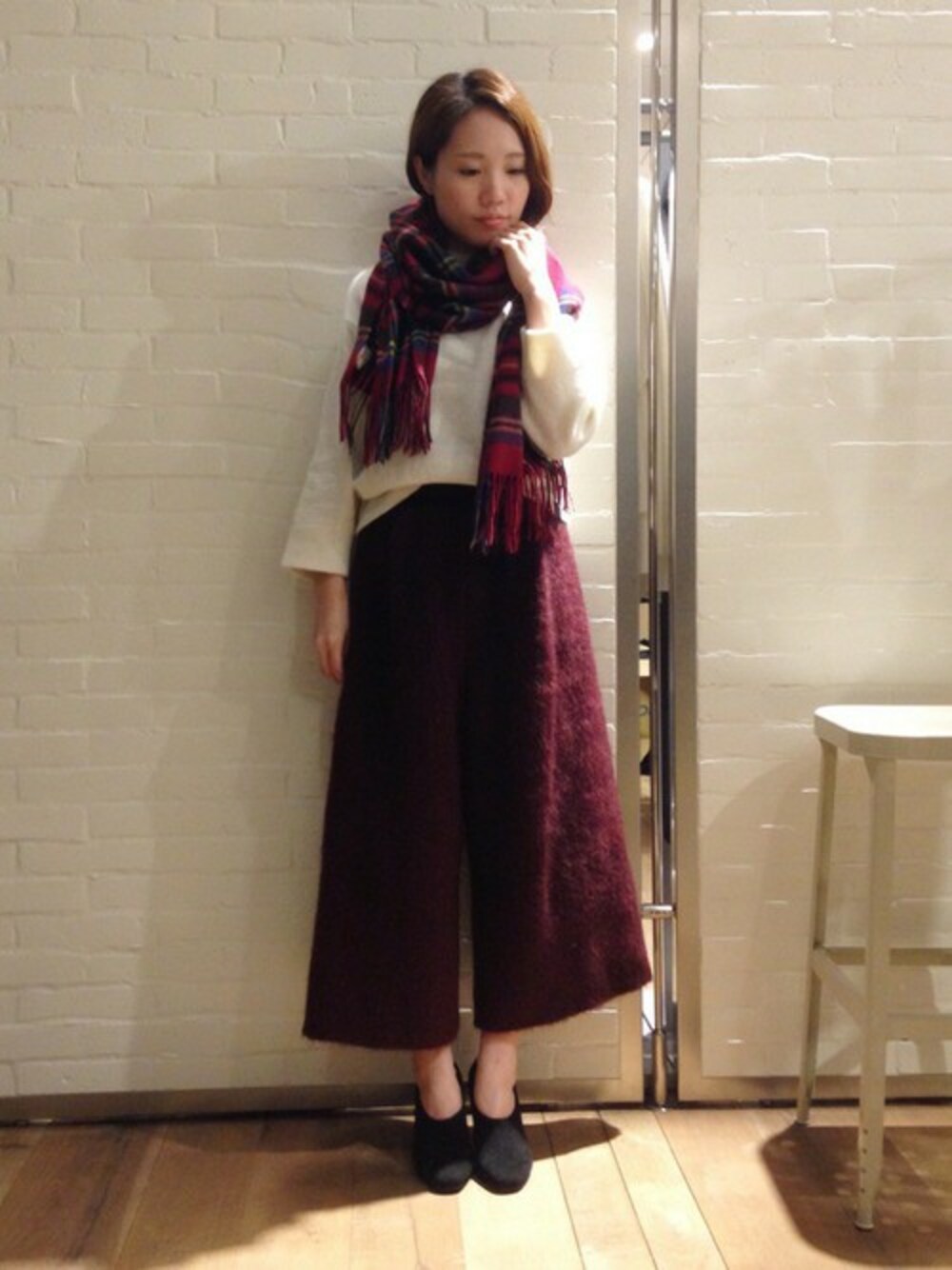 そろそろストールが活躍するシーズンです。 ワインレッド×赤チェックストールの合わせも オフホワイトの優しい雰囲気のニットを間に挟めば相性◎ チェックストールはこのほかに、3色の展開となっています。