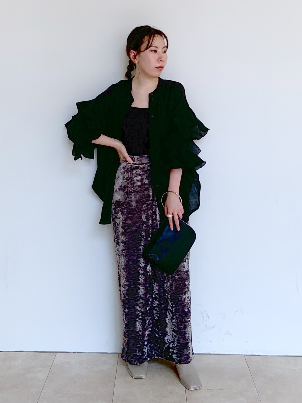 153cm/骨格ウェーブ/ブルベ冬 ブーツ着用:37(23~23.5cm) その他着用:F 袖フリルのブラウスを羽織りとして合わせました‼️ ベロアスカートでワンランク上のお洒落見えコーデに👑 スカートは、丈感長すぎないので低身長さんにもおすすめです🙌🏼
