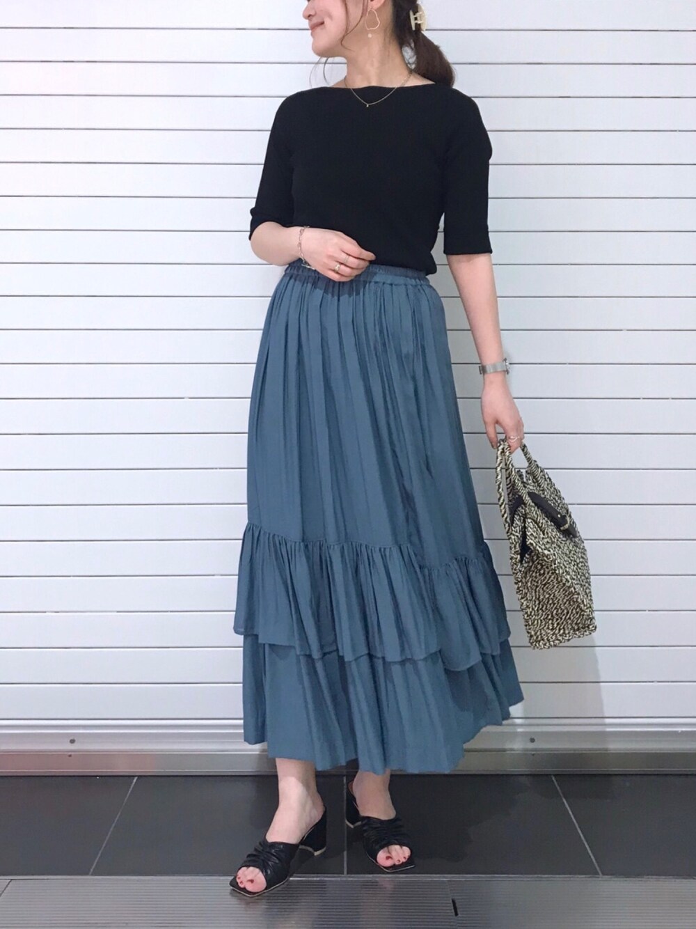 【スタイリング】 ガーリーなデザインスカートを 黒アイテムで締めた大人可愛いスタイリング。 【スカート】 アシンメトリーのティアードスカートは 歩いたときの揺れ感がキレイ♡ 落ち感のある素材なので、 ボリュームもですぎず着て頂けます。 あると嬉しいサイドポケット付きです〇 【ニット】 ニットは背中のデザインがポイント☝︎ 絶妙な開き加減で 下着のラインをカバーしてくれます〇 細リブで着痩せ効果も◎ お手入れはマシンウォッシャブル対応です。