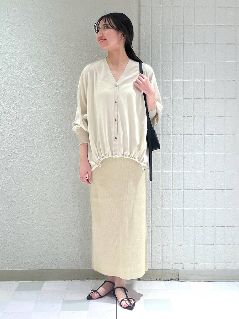 【カーディガン】 UVカット、接触冷感機能がついた夏に着やすいカーディガン。 ゆったりしたサイズ感で体のラインも拾いにくく、体型カバーも叶います。 タイトスカート合わせだったので今回は、裾のドロストコードを閉めずに長めで合わせて体型カバーをしています。 【スカート】 伸縮性の高い楽に履けるスカートです。 光に当たるとツヤっとキラキラする素材で今年らしく着られます。