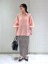 【トップス】 シアー素材のシャツは、落ち感のある素材でボリュームが出過ぎすぎ着られます。 甘くなりすぎないピンクで大人も着やすいカラーです。 【スカート】 伸縮性の高い楽に履けるスカートです。 カラー合わせもしやすい柄は、着回しもしやすく履くだけで華やかな印象に。