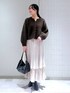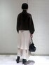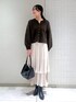 【カーディガン】 ふわふわ素材で軽くて着心地のいいニット。 前が開くので羽織とし着るのも◎ 袖のたっぽり感がフェミニンな印象で着られます。 私の身長で腰骨が隠れる着丈で短すぎずに着られます! 実際に購入し洗濯もしていますが、伸びや毛玉も気にならずに着られています。 【スカート】 ティアードシルエットで動くたび揺れ感がかわいいスカートです。 ウエストもオールゴムで楽な履き心地です!