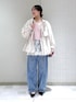 【カーディガン】 ピンクが春らしくて可愛いカーディガンです♡ レースのキャミソールと合わせて着ています! レースを合わせることで今年らしく見える+お尻周りもカバーしてくれて安心です。 【デニム】 コクーンのボリューム感が可愛いデニム。 とっても柔らかいので履き心地もいいです! 【アウター】 ウエストマークができてスタイルアップが叶います。