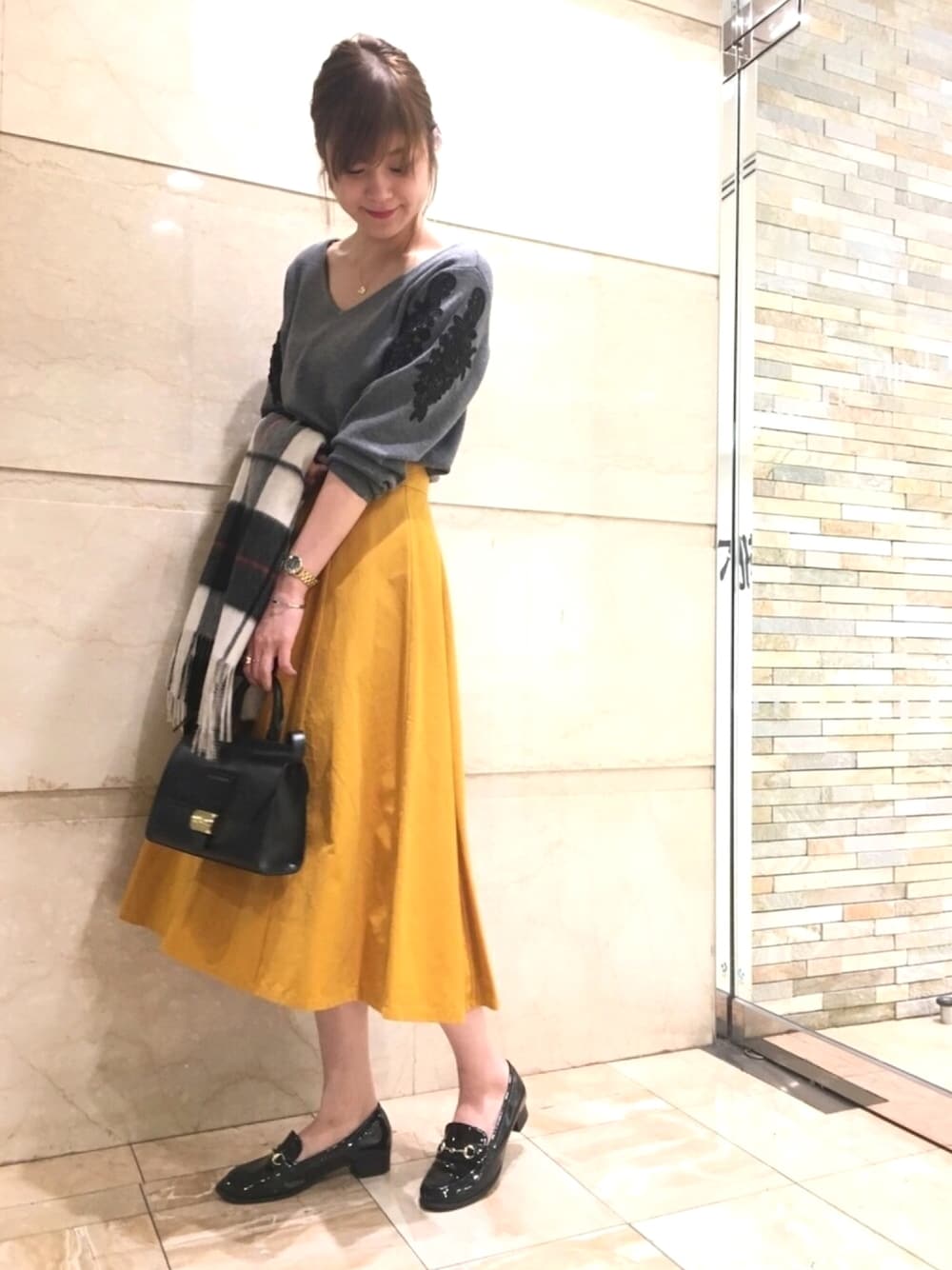 カラースカートを主役に、新着の刺繍ニットでたまにの女子ルック😊💓 ウエストをキュッと細く見せてくれるスカートは丈長めなのでペタンコシューズのバランスも🙆