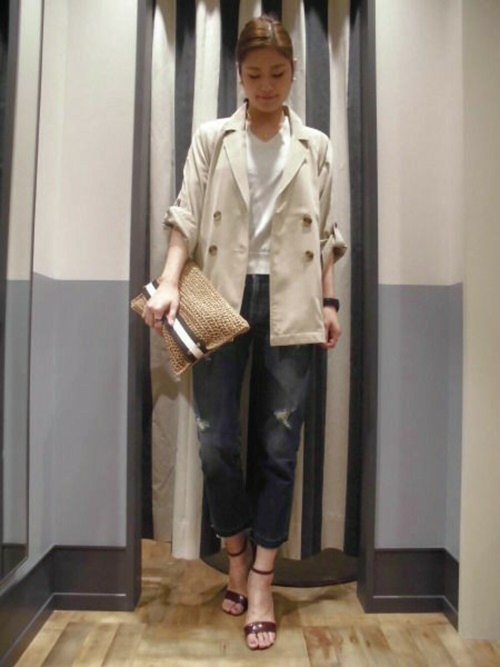 人気のトレンチコートが入荷しました! デニム×Vネックニットを合わせシンプルにまとめました♪