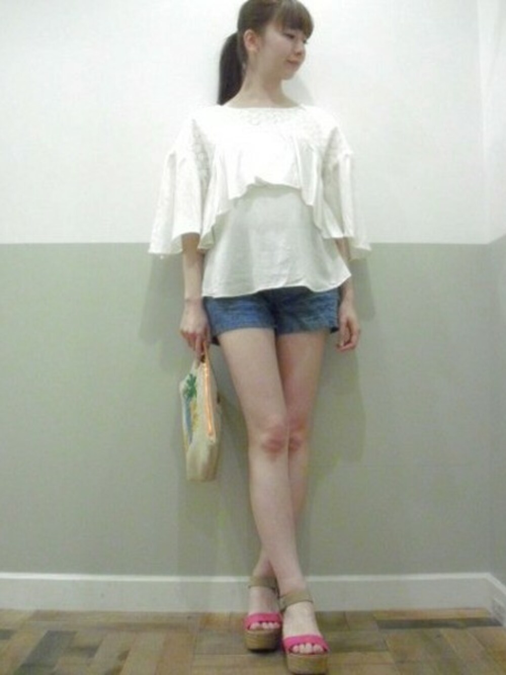 ケープデザインのブラウスに、ラメデニムとスウェードサンダルを合わせたリラックスコーデ!