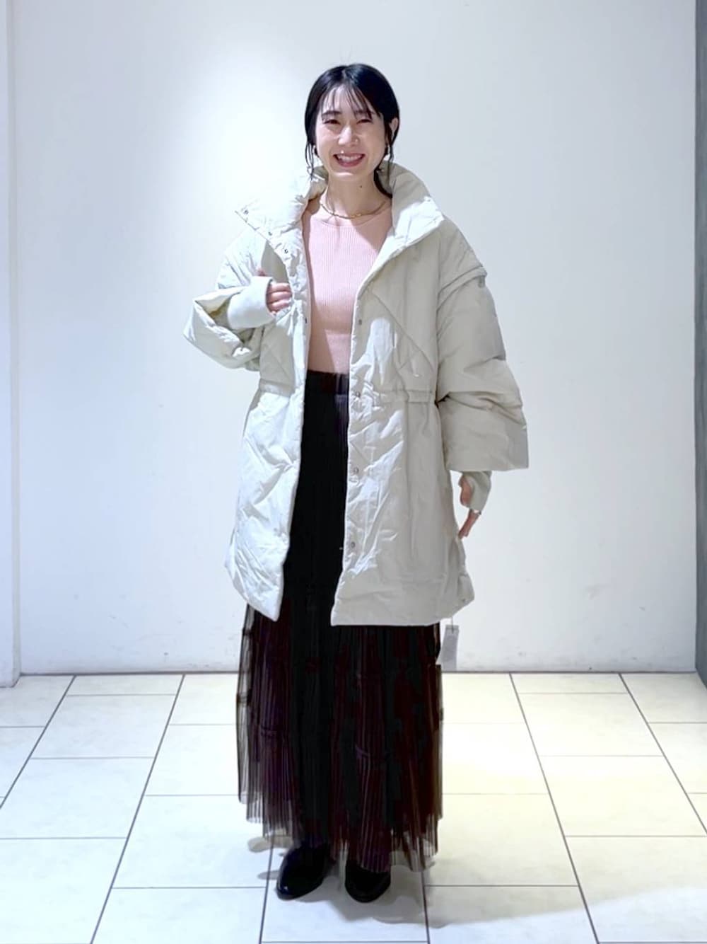⭐各アイテムのおすすめポイント  ̄ ̄ ̄ ̄ ̄ ̄ ̄ ̄ ̄ ̄ ̄ ̄ ̄ ̄ ̄ ̄ ̄ 【トップス】 ピタっとニットは、シーンを選ばないので重宝しますよね✨ 気分があがるラメも上品な印象です! 【ボトムス】 チュールの軽やかさがあるので、シンプルニットとの相性も◎ フラットシューズでもひきづらない長さでした! 【アウター】 フリーサイズ着用すると、太ももあたりまでのミドル丈で着ることができました✨ ウエストの切り替えでめりはりがつくので、小柄さんでもおしゃれ見えしますよ!