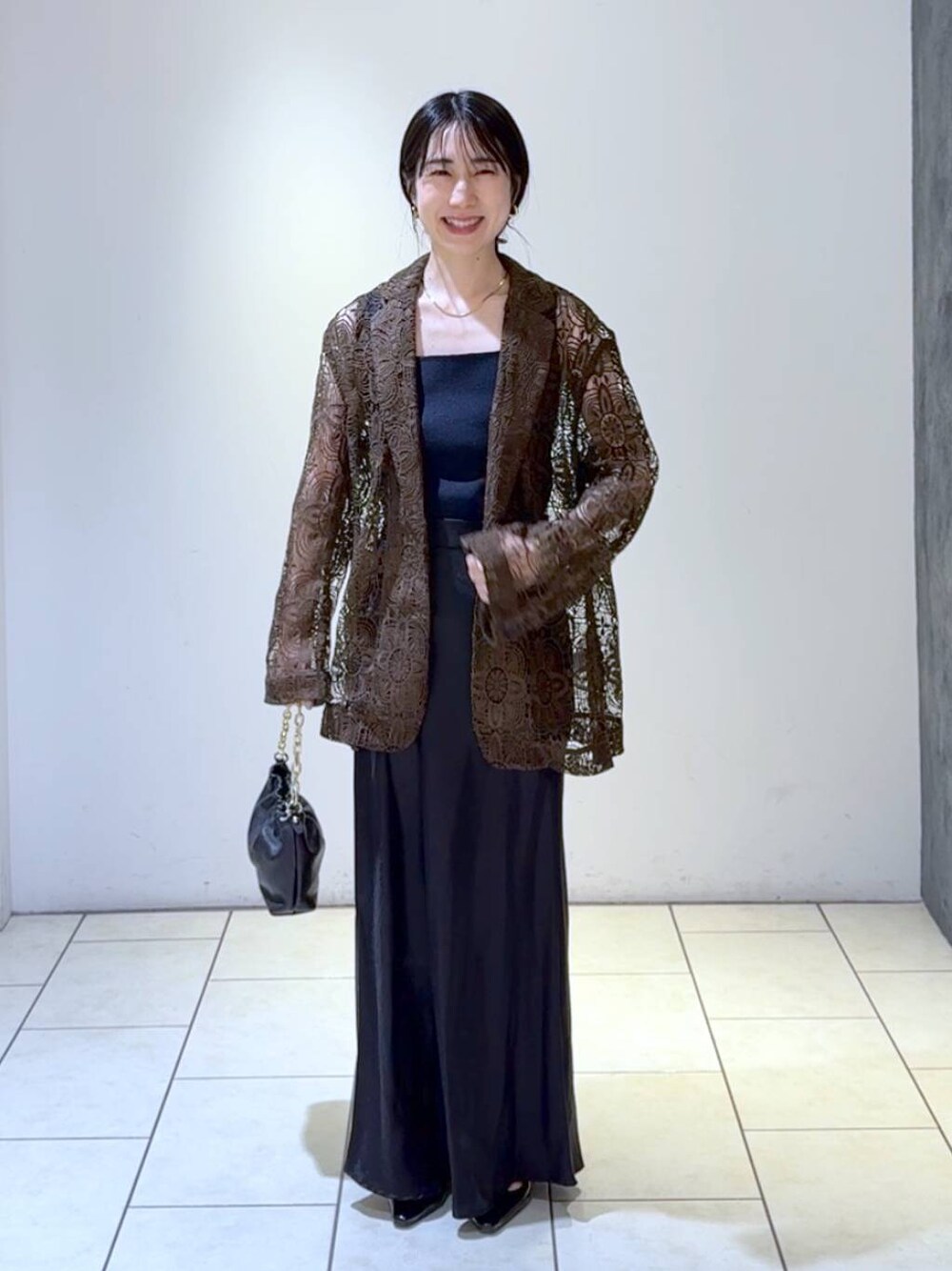 ⭐各アイテムのおすすめポイント  ̄ ̄ ̄ ̄ ̄ ̄ ̄ ̄ ̄ ̄ ̄ ̄ ̄ ̄ ̄ ̄ ̄ 【トップス】 前後2WAYで雰囲気を変えることができるのが嬉しいポイント✨ きちんと見えコーデにおすすめです! 【ボトムス】 腰回りすっきりのナロースカート! ずるっと履くのがいまの気分♡ 【アウター】 大きめなレースの柄とざっくりした編地が上品見え✨ ちょっと羽織りたいけど、普通のジャケットは飽きたな〜、、、の方におすすめのデザイン◎