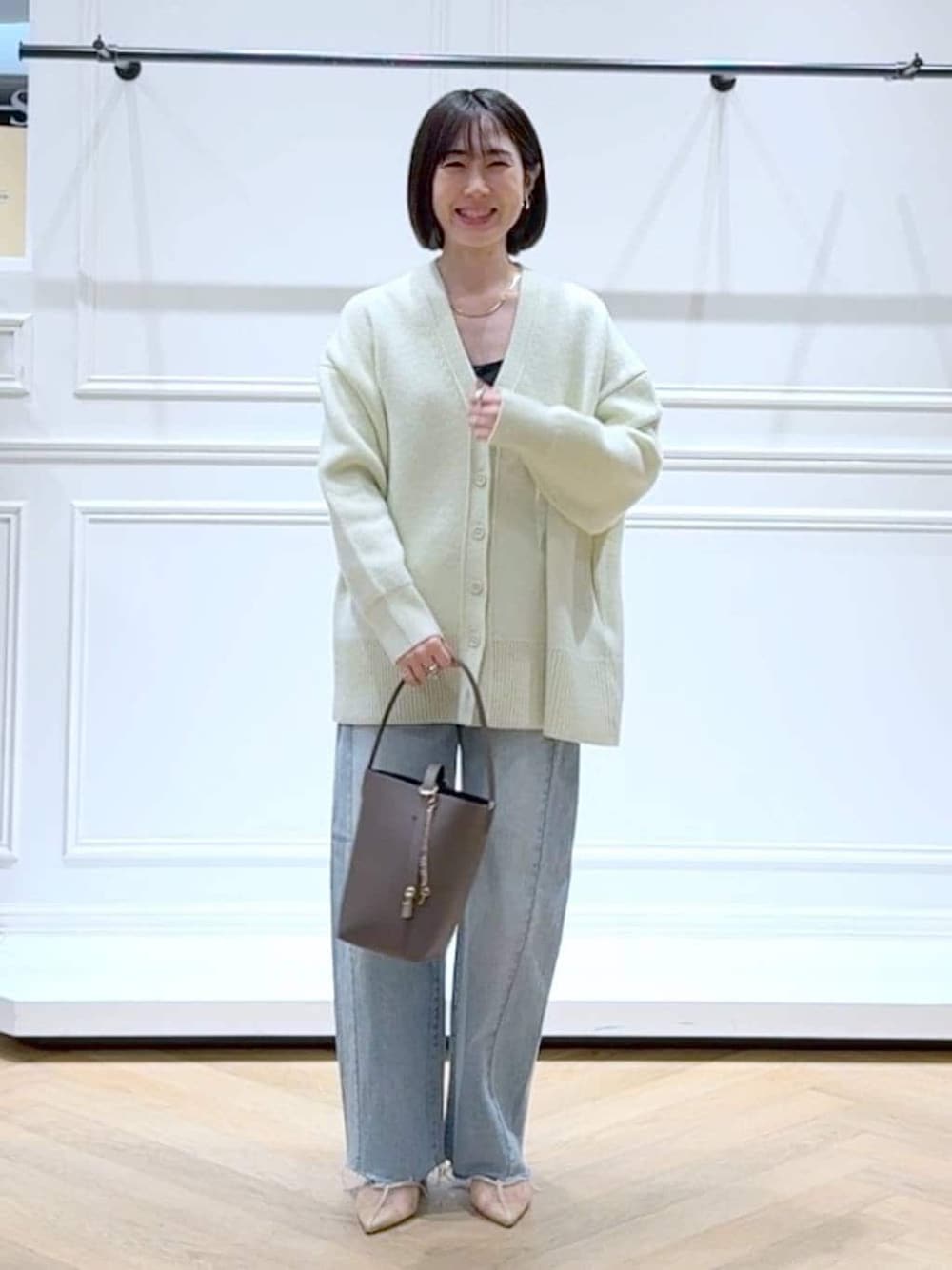 なかみ(apart by lowrys ルミネ立川)のカーディガン/ボレロ「カシミヤコンBIG Vネックカーディガン」を使ったコーディネート