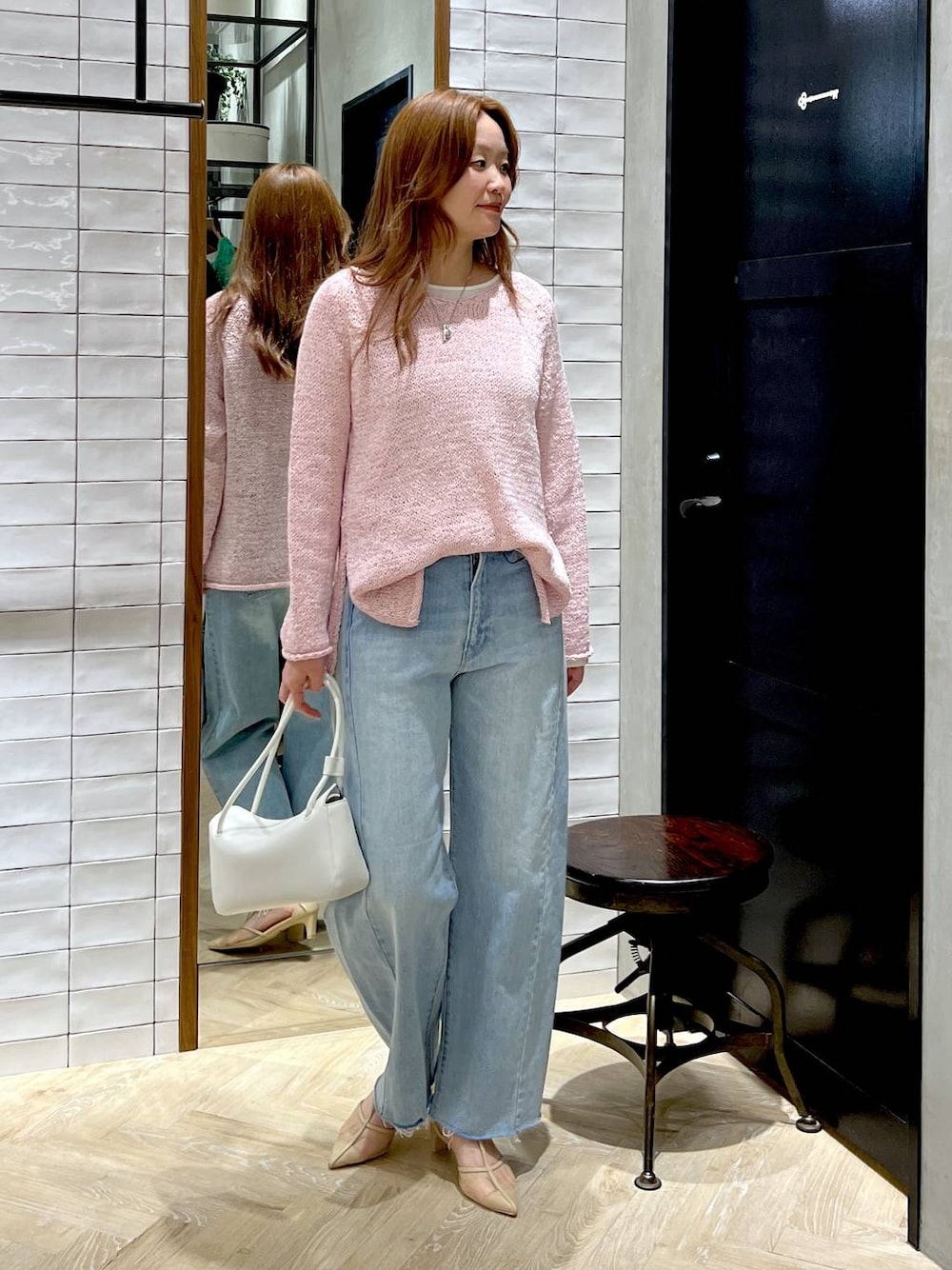 【ニット】 優しいピンクで取り入れやすいです✨ 今回は中に1枚カットソーを着用していますが、キャミソールなどでも大丈夫です🙆 チクチクしないです! 【インナー】 柔らかい生地で若干の伸縮性があるので着心地が楽です✨ 1枚は持っておきたいアイテム🥺 【デニム】 前回のコクーンデニムと比べると少しコンパクトめで、すっきりした印象になっています! ボリュームが出過ぎない方が良い方はこちらの新作がおすすめです✨ 【バッグ】 とにかく軽いです✨ 飲み物が入るので安心! 見える部分の金具は白で統一されているのでおしゃれ✨ 【パンプス】 とても柔らかい履き心地です! 普段のサイズでいいと思います👍 画像では37インチを着用しています。 37もはけるのですが、緩めの方が足が疲れにくいので少しゆとりがあるサイズがおすすめです! 私はいつも24センチで、少し踵が余るくらいですが、ストラップがあるので安定しています✨ 透け感が上品で素敵です😊