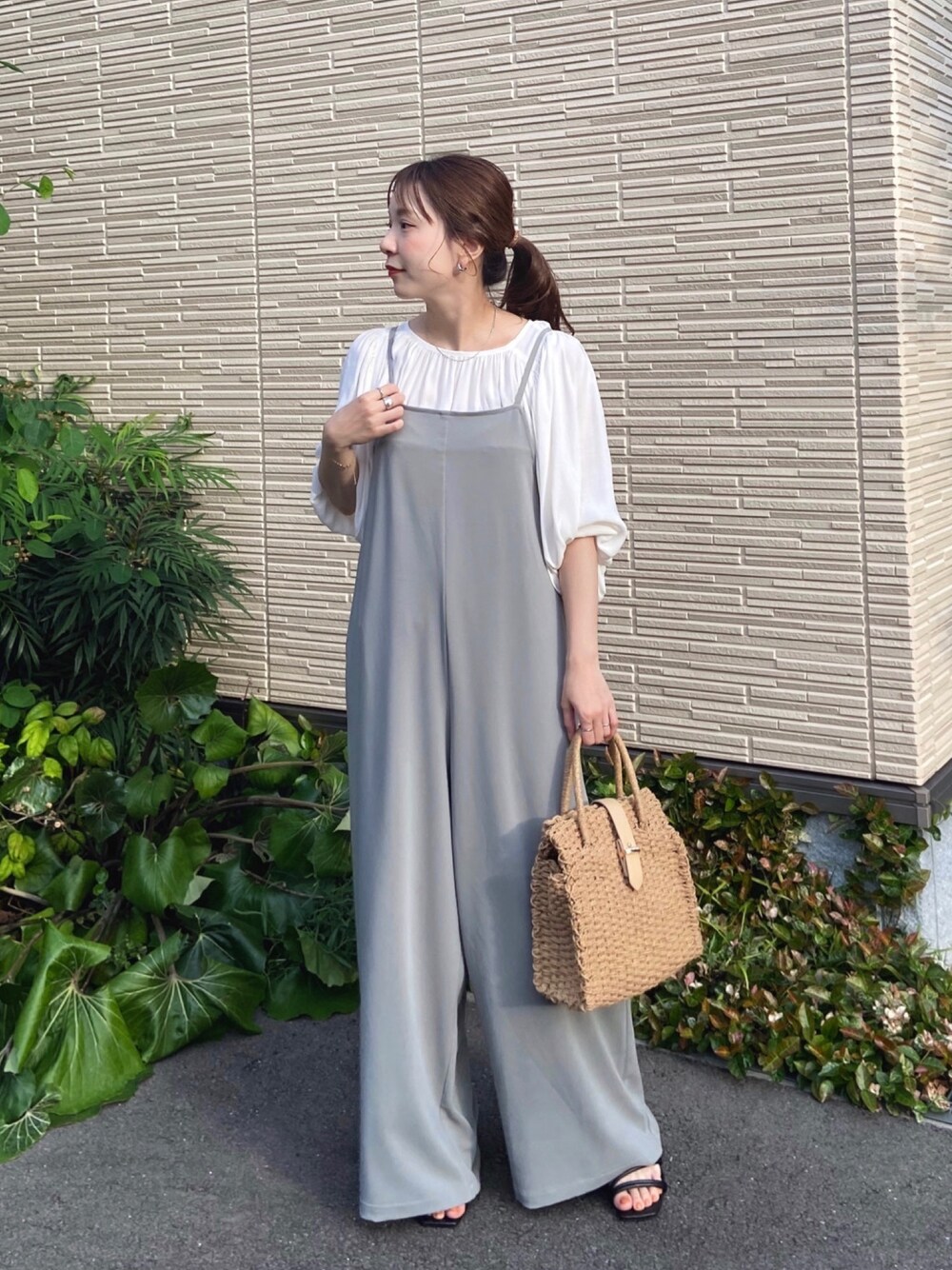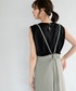 ギャザーたっぷりのブラウスは、前後で着れる2way使用。 袖口がゴムになっているので腕まくりして、ボリュームを出して着るのがおすすめ。 サロペットは、とろみ感のある素材なので上品な印象に。