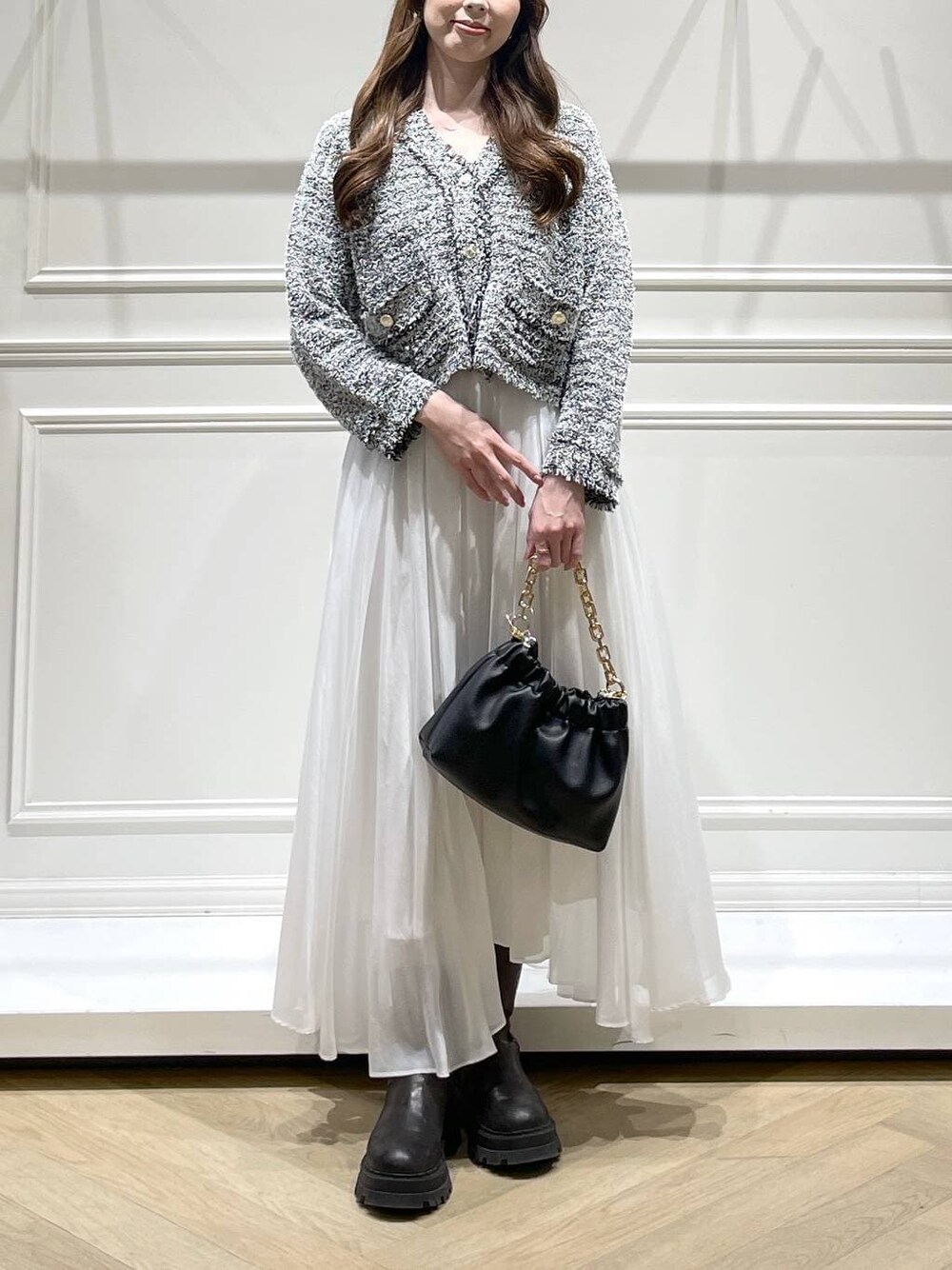 カーディガンは柔らかいニットなので 体のラインに沿うように、 すっきり見えるデザインです。 どんなボトムスにも合わせやすい着丈も魅力◎ スカートは裾のカットに動きがあり、 お洒落で、映えるアイテム◎ 真っ白なのでカラー合わせを楽しめたり シャープな雰囲気になります!