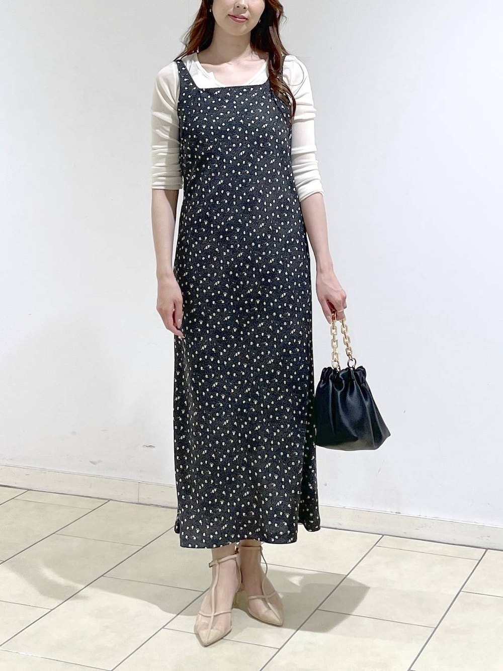ワンピースは小花柄が可愛いデザイン♡ スカートが広がりすぎないので 甘さ控えめな印象になります。 肩紐のアジャスターで着丈の調節も可能で 小柄な方でも安心して着ていただいています◎