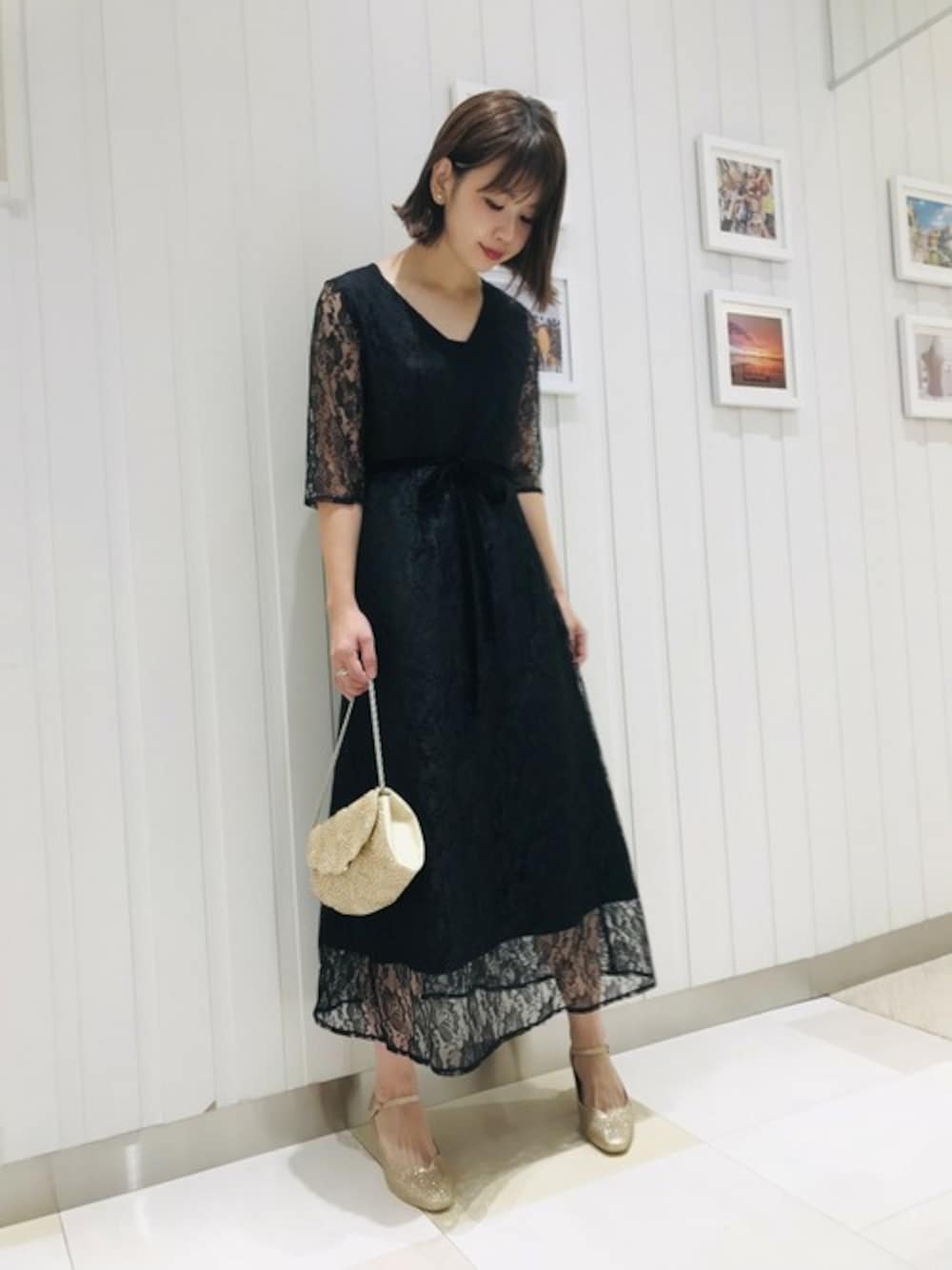 華奢なレース感とVネックでコンパクトな印象にしてくれるワンピース。丈が長めなのでシンプルでも子供っぽく見えないので、華やかな席にピッタリです。