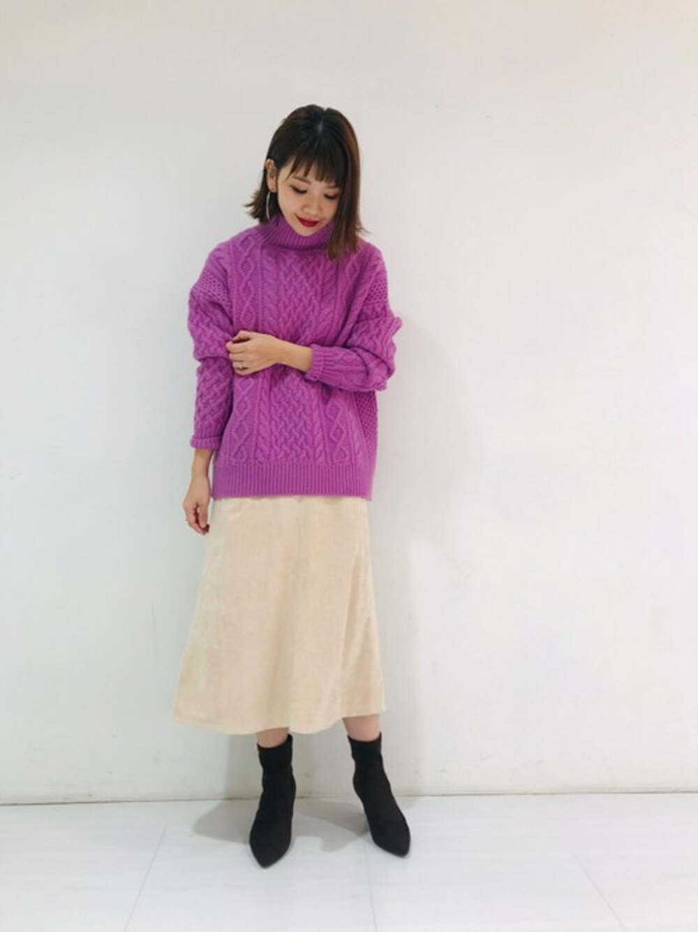 ケーブルが可愛いニットが入荷しました! 鮮やかなパープルは今年らしくて鮮度アップ☆ ざっくりニット+スカート合わせは旬顔コーデです♪