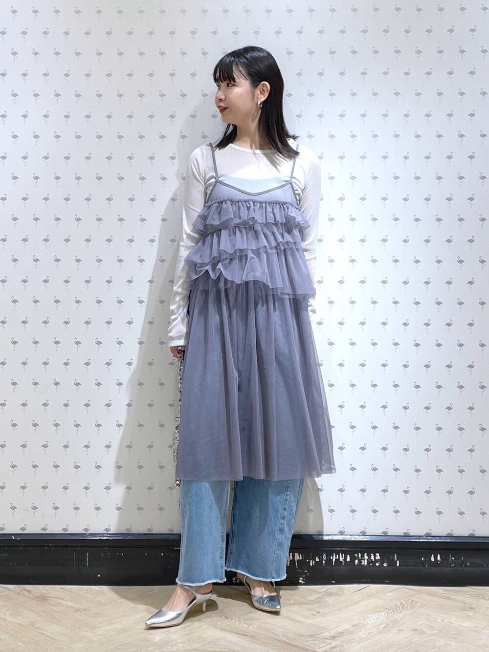 今年らしいチュールワンピースは ロンT×デニムコーデに重ねるだけで旬なコーデに。 ボリュームおさえめで合わせやすいです!