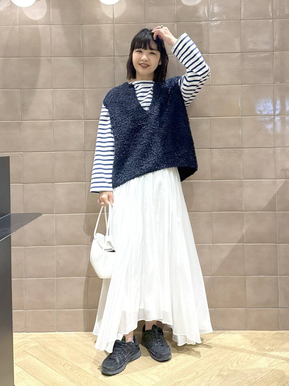 春に大活躍のベスト ふわふわ素材が可愛い♡ チクチクせず、毛抜けも気にならず、何より軽いです! ボーダーを入れてポイントにマリンルックに