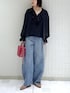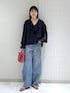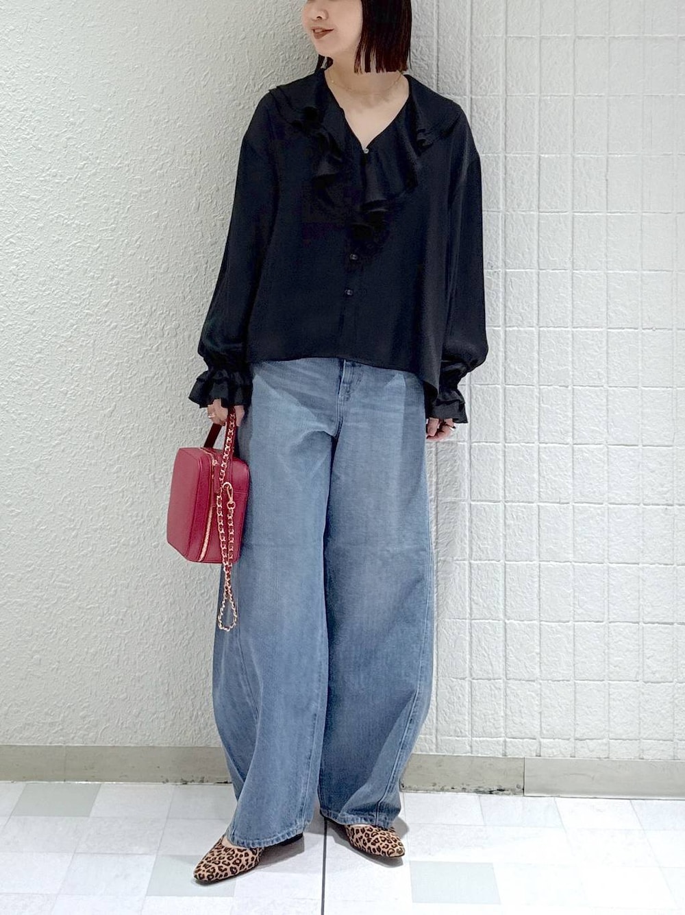 フリルが可愛いブラウス 定番のデニム合わせで甘くなりすぎないコーデ バッグとシューズをポイントに🐆🍎