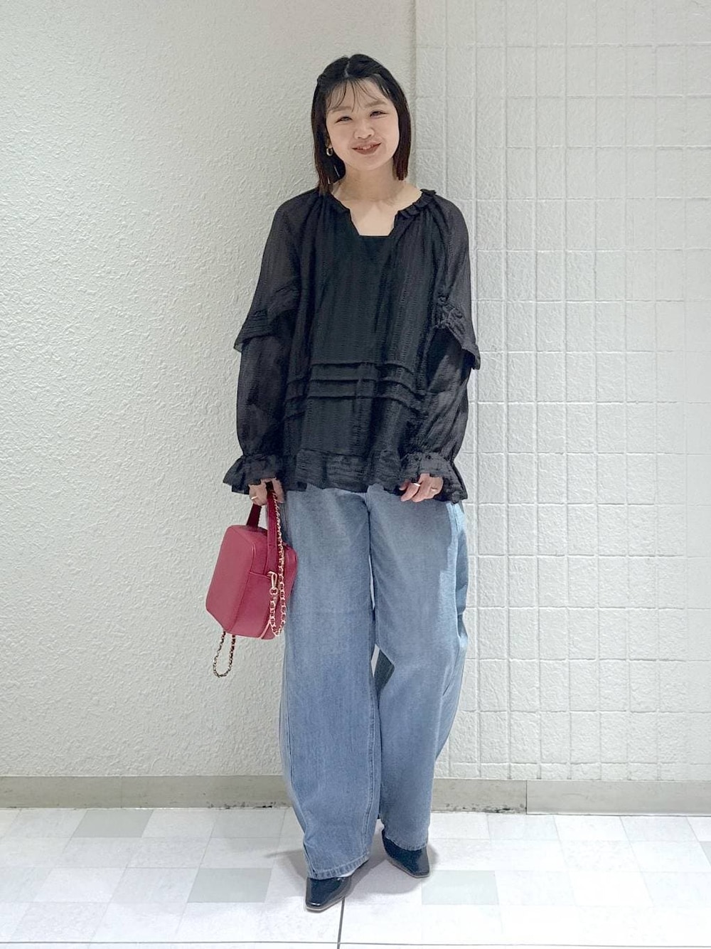 リアルバイコーデ ブラウスは迷いに迷ってブラックに 普段甘めを着ない方もデニムを合わせてカジュアルに おすすめです◎