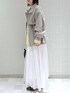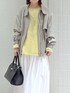 イエローがポイントのコーデ 他のカラーをグレー×ホワイトの落ち着いたカラーにまとめるとカラーものは取り入れやすいです💛